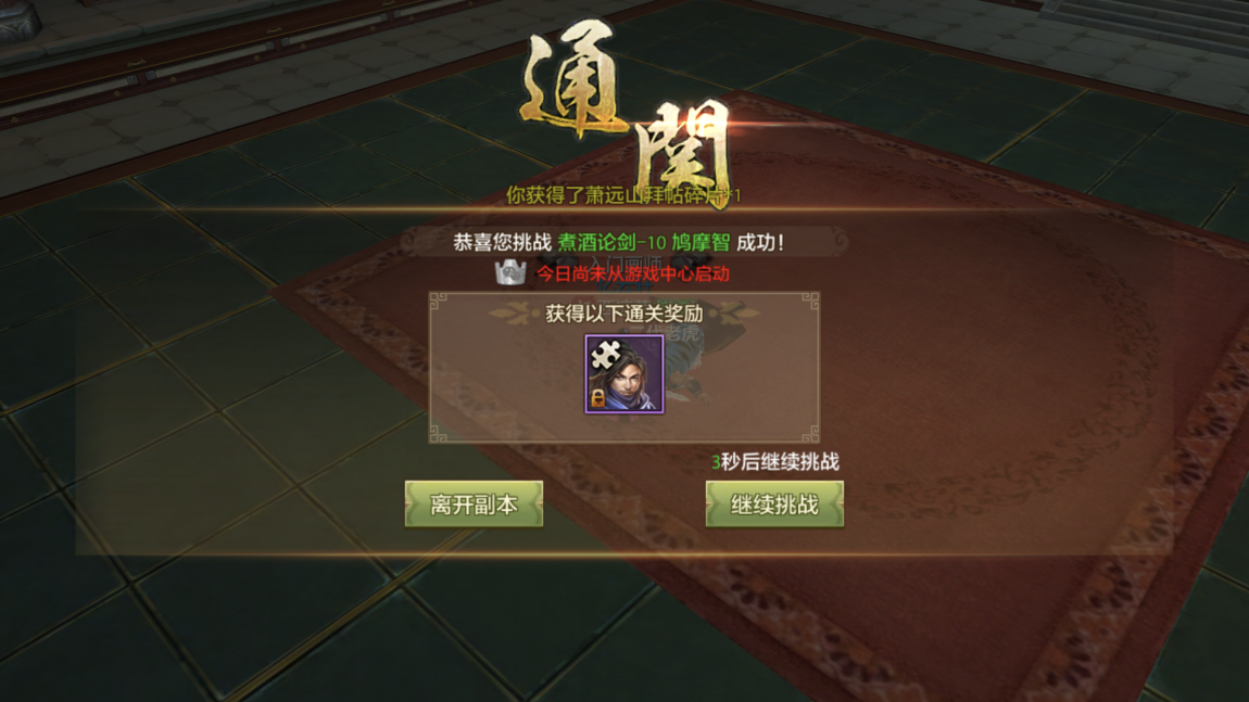 挑战成功后如无其他操作则会自动开启下一节挑战。当我们顺利通过一些章节后还可以使用扫荡功能重新获得之前章节的随机掉落奖励,但首次通关奖励则不会再获得。