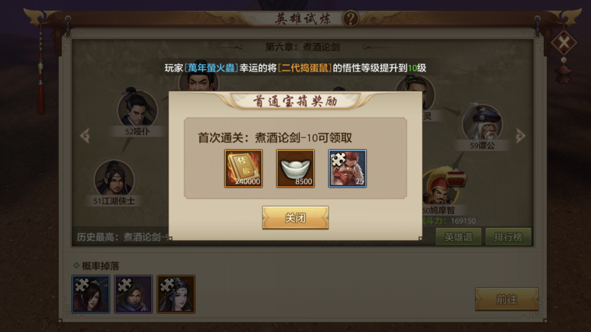 英雄试炼掉落道具是培养英雄好感度用的道具。首次通过指定关卡数时还可获得特殊奖励,其中包括重楼肩和元神丹、无崖子拜帖等。通关126关则可以获得超级极品装备重楼肩。