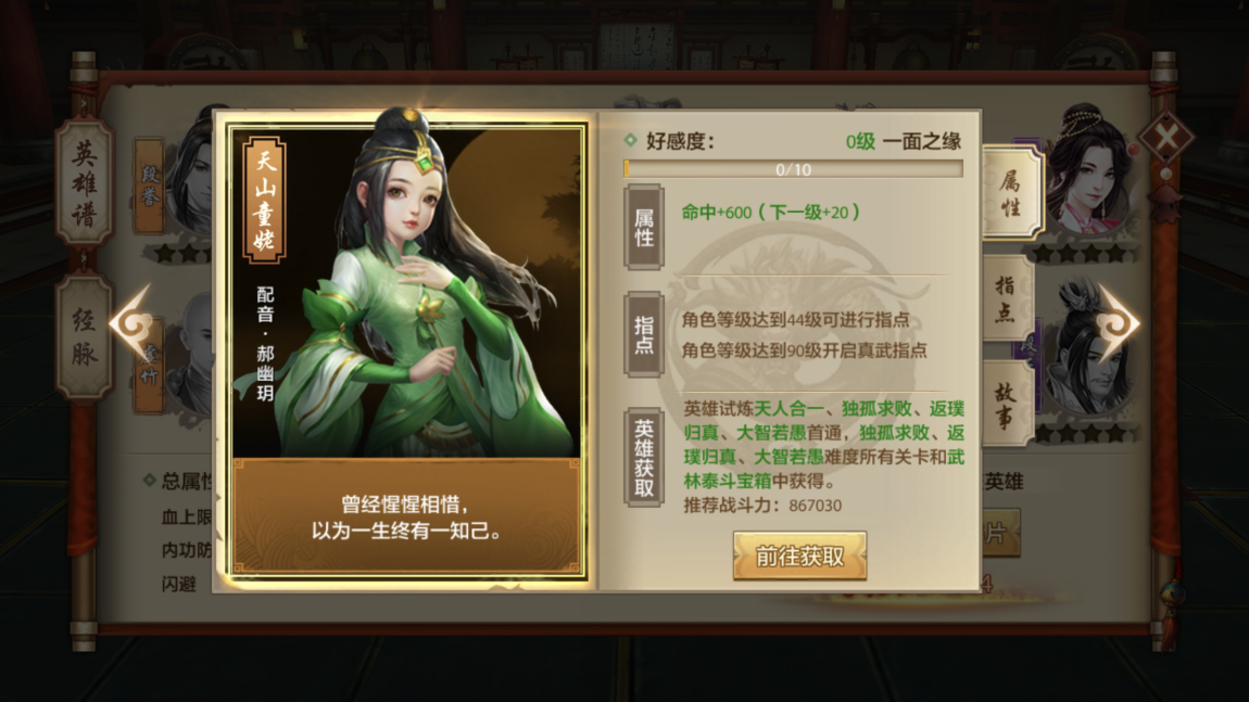 天山童姥碎片比较珍惜会在较后的章节出现,除了橙色碎片后期的试炼还会掉落重楼肩和元神丹、无崖子拜帖等宝物。所以我们要努力提升战力才能与童姥见面呦。