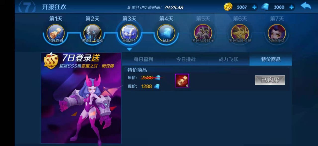 3.在上述的都完成之后还有多余的钻石的话可以选择,开服狂欢中的特价商品,1288钻石购买祈愿召唤10连抽,是正常价格的半价,也能为玩家省下不少钻石。