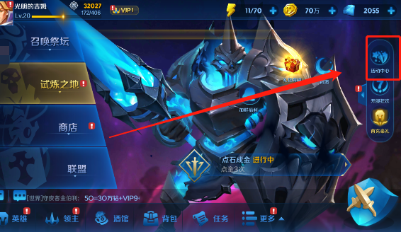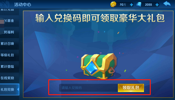 (1)进入到游戏中的主页面,点击画面右边的“活动中心”按钮。将左侧一览滑到最底下就可以看到礼包兑换了,点击输入兑换码即可兑换。