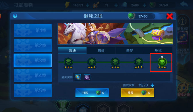 1、在混沌之镜第三章的普通关卡全部通关后,可以得到火箭熊提莫。挑战混沌之镜需要消耗混沌结晶,混沌结晶会自己慢慢回复。