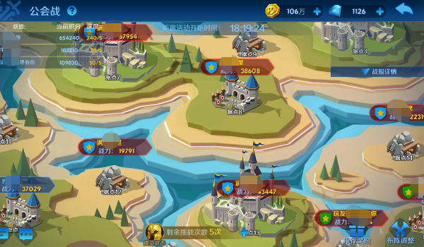 (1)公会战于每周六19-20点开启,开启后,所有公会进入一个战场进行据点抢夺,据点共分3个等级,每个等级的据点每分钟获得的积分不同,最后根据每个公会获得的积分进行排名结算发放奖励。