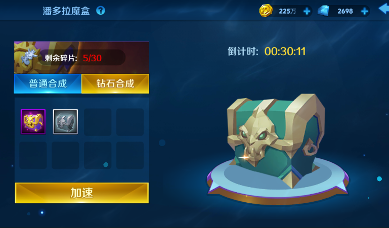 1、高级神器宝箱:可以通过酒馆中的潘多拉魔盒获取,使用30个碎片可以合成一个魔盒。碎片可以通过完成酒馆任务得到,任务品质越高获得的碎片数量越多,也可以花费钻石直接合成为最高级的魔盒。绿色魔盒几率20%、蓝色魔盒几率64%、紫色魔盒几率55%、橙色魔盒几率20%。