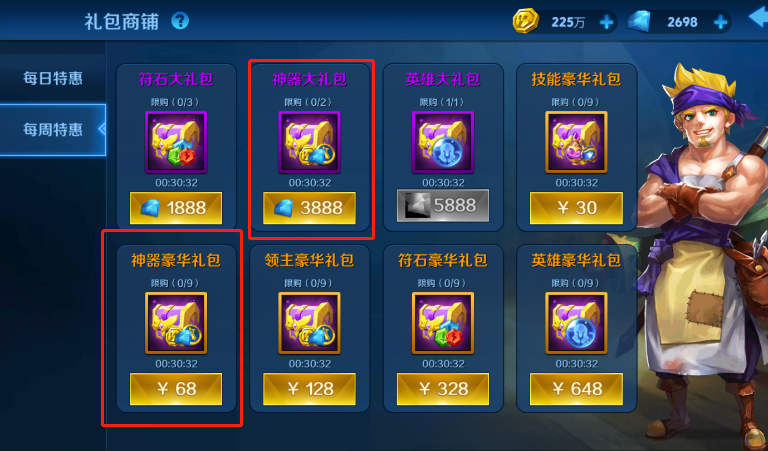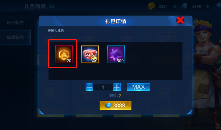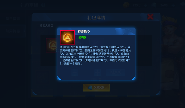 2、神器核心:可以在“礼包商铺”中购买获取,每日特惠中的六元礼包可以得到两个神器核心。也可以在每周特惠中购买神器大礼包,3888钻石20个神器核心,每周可以购买两次。有条件的玩家也可以选择神器豪华礼包,68元5个神器核心,每周可以购买五次。