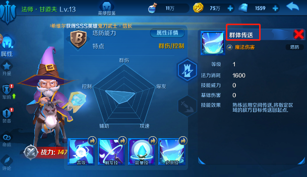 1、法师甘道夫:法师甘道夫拥有群体传送和单体传送,初始伤害不够的情况下,可以使用这个能力来提升输出的空间。