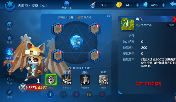 2、毒矢:被动触发技能,技能威力200点。对敌人造成物理伤害并使其中毒,每秒扣除其5%血量持续3s.。
