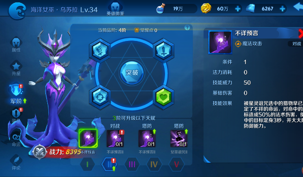 2、不详预言:被动触发技能,技能威力50点。对命中的目标造成法术伤害,使命中的目标行动迟缓。