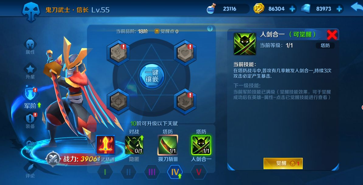 3、鬼刀信长最特别之处就在于其高爆发的普通攻击,因此觉醒技“人剑合一”是一定要觉醒的。觉醒后在塔防战斗中,普攻有几率触发人剑合一,持续3次攻击必定产生暴击。