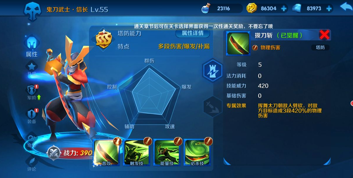 3、BOSS能力:在这个模式下鬼刀武士信长为五星,算是目前角色中顶尖的存在。