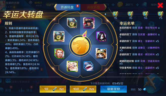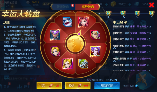 (4)高级转盘概率为,红色英雄0.12%;红色碎片24.14%;橙色英雄0.3%;橙色碎片24.14%;紫色英雄1.2%;紫色碎片24.14%;蓝色英雄1.81%;蓝色碎片24.14%。
