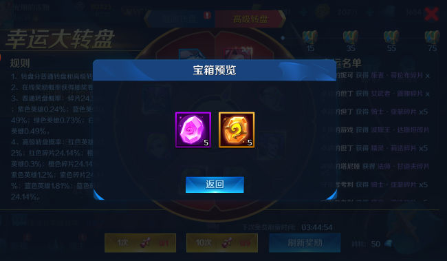 (3)普通转盘概率为,碎片24.5%;紫色英雄0.24%;蓝色英雄0.49%;绿色英雄0.73%;白色英雄0.49%。