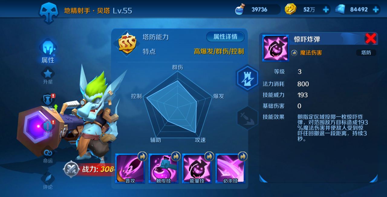 2、核心对战技能为爆枪射击,在塔防战斗中,每普攻4次后,下一次普攻伤害提高200%。惊吓炸弹对范围敌方目标造成魔法伤害,并使敌人受到惊吓往回撤退一段距离,持续3秒。