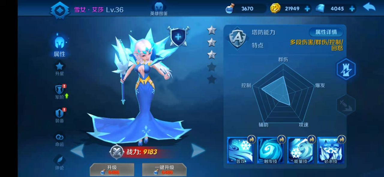 雪女艾莎,异域英雄,主要定位是多段伤害,群伤,控制,回怒,技能的效果还是挺多的。