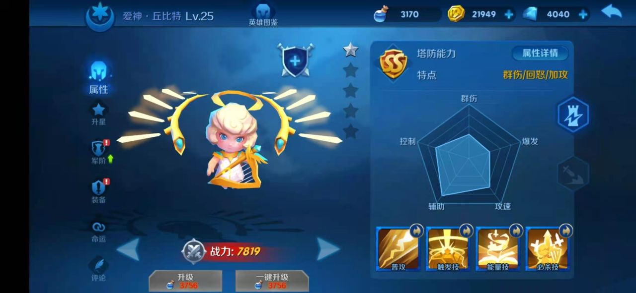 5.屠夫秋秋和爱神丘比特都是辅助类型英雄,屠夫可以增强其他英雄的攻击力和攻速,可以多把BUFF给孙悟空,丘比特可以增加攻击力和回复怒气速度,可以把BUFF给妲己,让她的击退技能可以高频率释放。