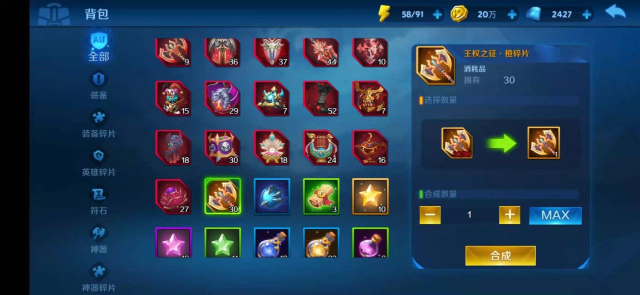 商店中可以购买各种高级武器的碎片,数量足够之后可以在背包中直接合成,其他还有4种升星石的材料,每天购买都有数量限制,有需要的小伙伴记得购买。