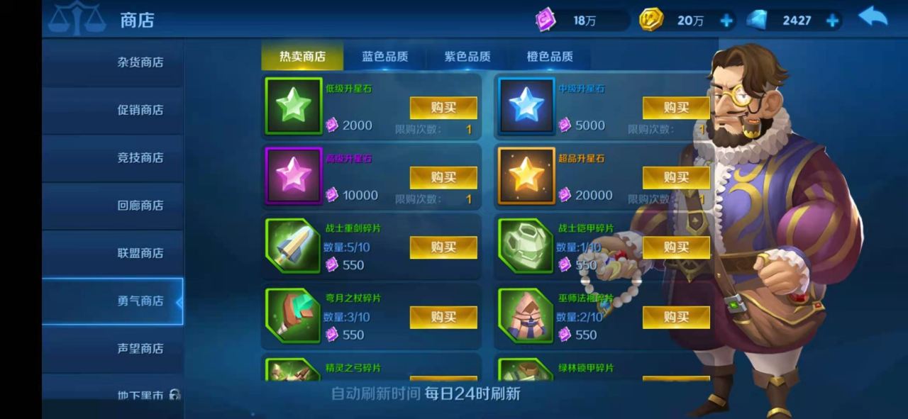 可以在商店界面的勇气商店中购买各种装备,有热卖商店,蓝色品质,紫色品质,橙色品质四个板块,紫色品质商店在勇气之塔通关75层开启,橙色品质需要通过120层开启。