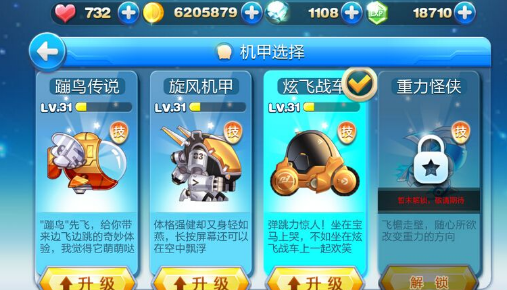 要想跑出1个令人满意的成绩,机甲选择的重要性同样是可不忽视的。在炫飞模式中,咱们在开场前可以选择一款机甲,游戏里有1次不收费的召唤机甲的机会,召唤出的机甲能够为咱们抵御伤害,将机甲升到61级还能够获取机甲防御盾技能,这样也是相当于机甲得到多一重的保护。