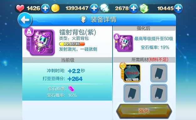 芯片方面,小编相对推荐“重力芯片”或“火箭芯片”,前面的芯片有助于帮助咱们快速降落,后面的芯片有助于咱们快速升起,二者对咱们后期灵敏闪避路障都比较有益;背包方面,小编推荐“镭射背包”和“羊羊背包”,这2款是全部背包中炫力值最大的,游戏里能提供更加高的加分特效;UFO方面,小编建议选“鹰眼UFO”或“雷神UFO”,前面的有概率让导弹坠落,后面一个有概率让雷管爆裂,二者都有助于提升咱们的容错性,提高短跑后期的生存力。