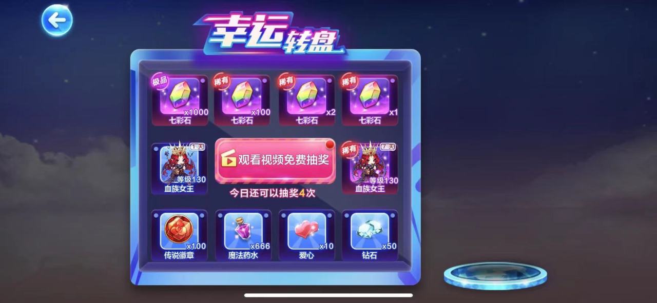 免费获取钻石的第二种方法,就是通过抽奖的方式,在游戏中会有各种各样的抽奖活动,其中最常见的就是幸运转盘抽奖,玩家观看视频可免费获得抽奖次数,一天可以抽奖五次,在这里面玩家可以获得很多优质的奖励,其中就包括50个钻石。