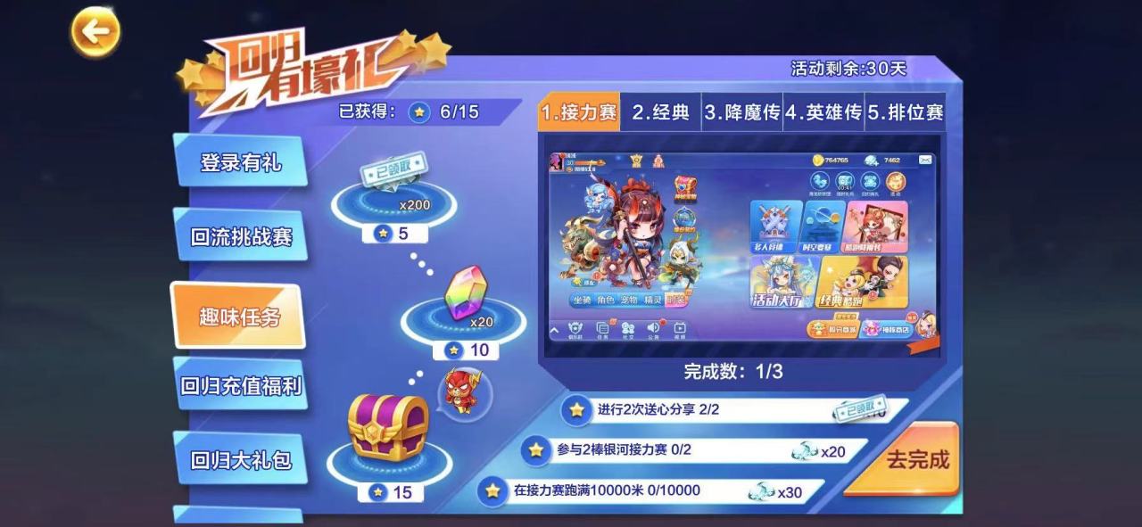 另外,如果是老玩家回归的话也会有一个回归任务,在这里面也是有钻石奖励存在的,玩家完成任务就可轻松获取,还是很简单的。