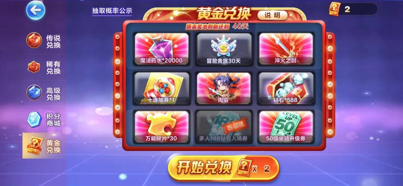 不过这个黄金兑换里面的奖品在一定时间内是会进行更换的,因此玩家要瞅准时机,千万不要错过啊,不然等到下次返厂又不知道什么时候了。