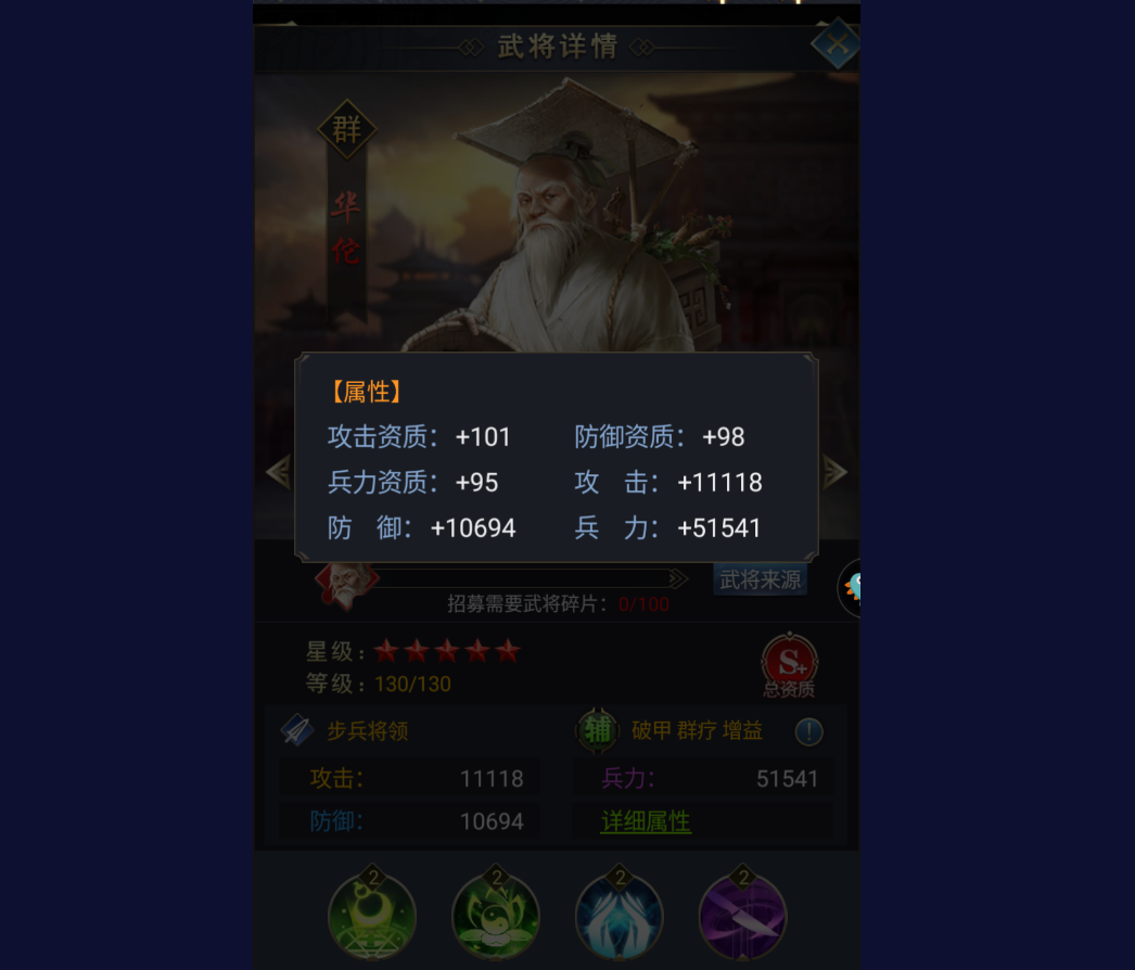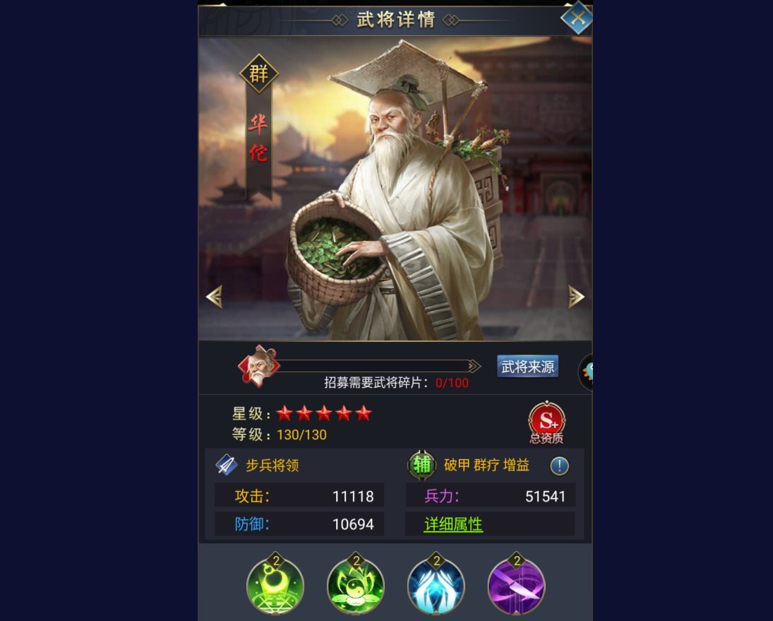 我们再来看他的整体属性如何,首先他是属于群雄阵容的一个步兵将领,总资质是S+,擅长的方向是破甲、群体治疗和群体增益,是一个纯粹的辅助武将,这也很契合他在历史上的定位。
