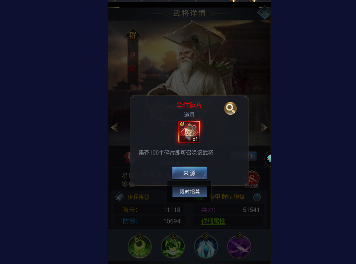 华佗在目前的游戏版本中是属于一个绝版的状态,获取的方法只有限时招募这一个方法,可想而知他的强弱程度。如果官方有限时招募开启的消息的话,小编会第一时间通知各位小伙伴,大家只需要无脑冲就行了,这个武将抽到就是赚到。