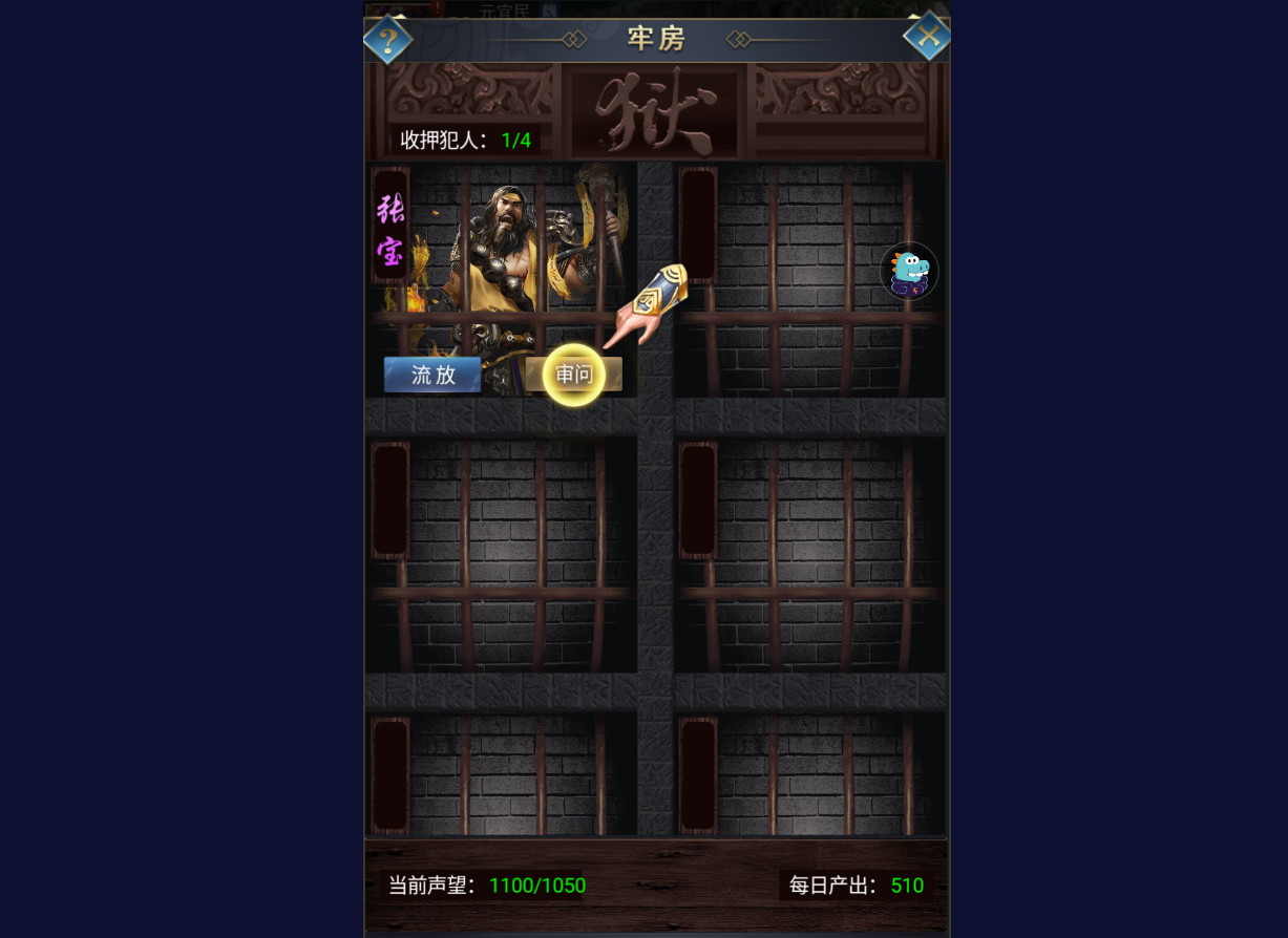 除此以外我们看到招降成功率不高的话可以进行关押,进行关押之后这个武将就会被存放到牢房之中。牢房的位置在游戏主城的左上角,点击进入就可以看到被关押的武将了。在牢房中我们可以流放或者审讯这个武将,流放会直接失去这个武将所以小编不建议大家去选择。