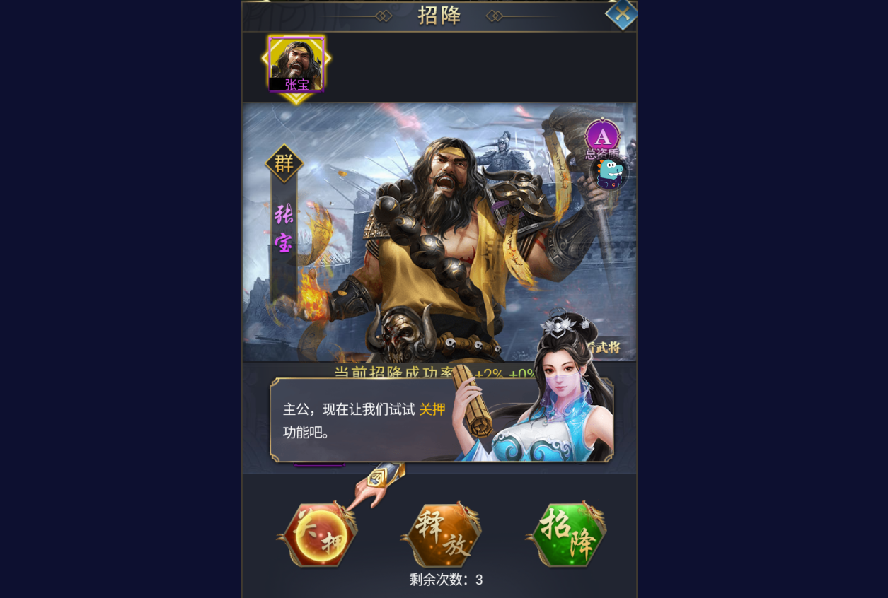 一般情况下我们只能在每个章节的最后一关才能招降到地方将领,并且这个战役一定要是三星完美通关,不然招降的几率会低很多。将一章的最后一贯完美通关之后点击确定,就会弹出一个窗口,下面有三个按钮,关押、释放和招降。