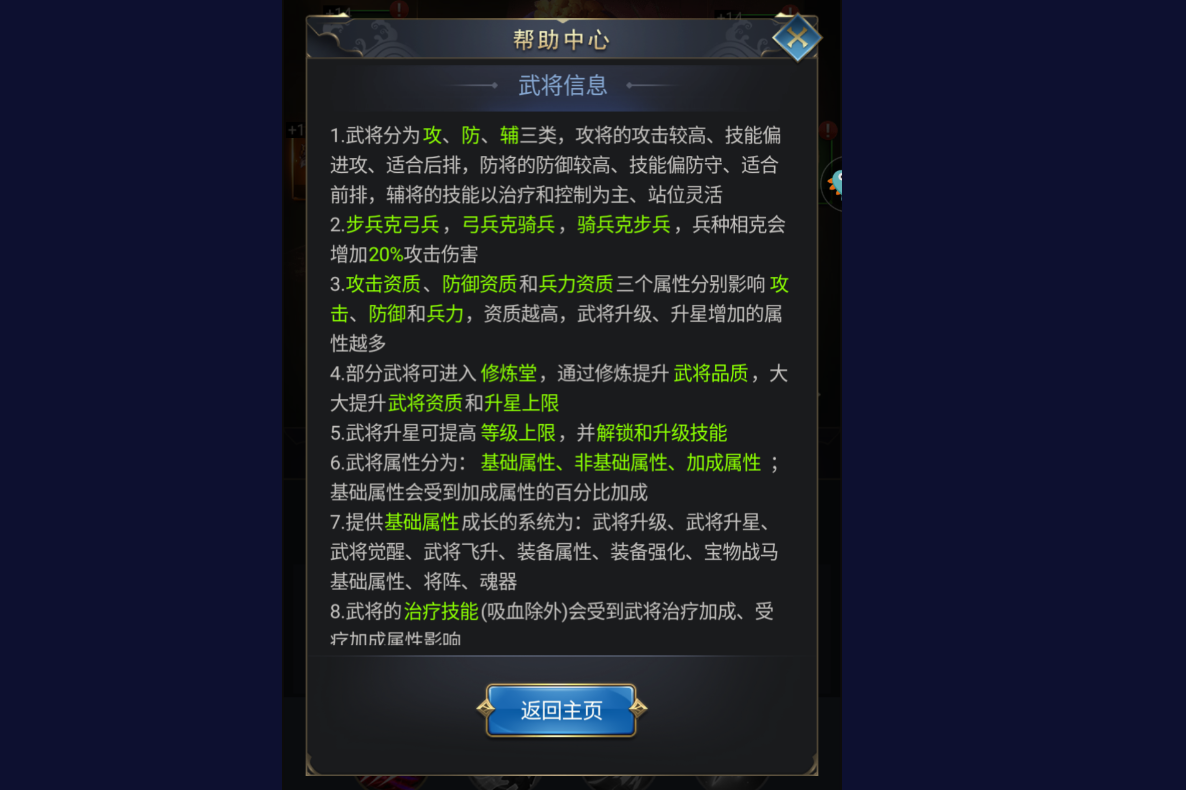 首先我们要了解武将从两个方面都分为三个不同种类的英雄,一方面是辅助、攻击和防御,另一方面是骑兵、步兵和弓兵,这样组合起来的就一共有9种不同类型的武将了。这些全部武将又分为四个阵容,魏国、蜀国、吴国和群雄,当然武将的势力和武将的战斗力是没有关系的,只是在有些玩法种会有势力的限制。