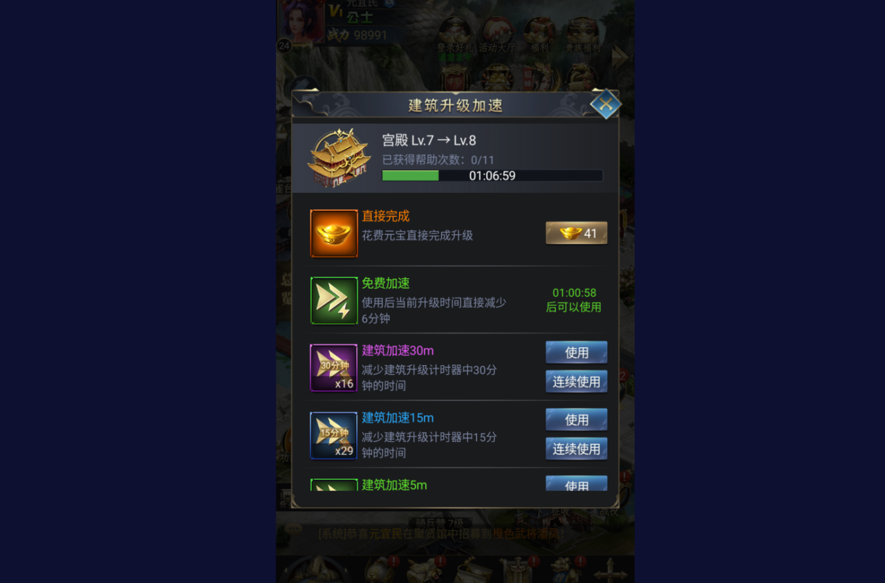 城池的建设呢需要花费元宝的地方就是加速了,我们在升级建筑的时候需要等待很长的时间,不想等的话可以使用元宝直接跳过等待时间。另外升级建筑的时候素材不够也可以用元宝代替,是不是非常方便呢?