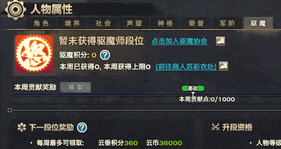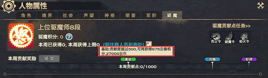 每日任务可以后的贡献度,驱魔贡献度达标之后可以在界面中领取到每周的工资。贡献度分为三个等级,基本,合格和好评,对应的奖励为50%、100%和120%。
