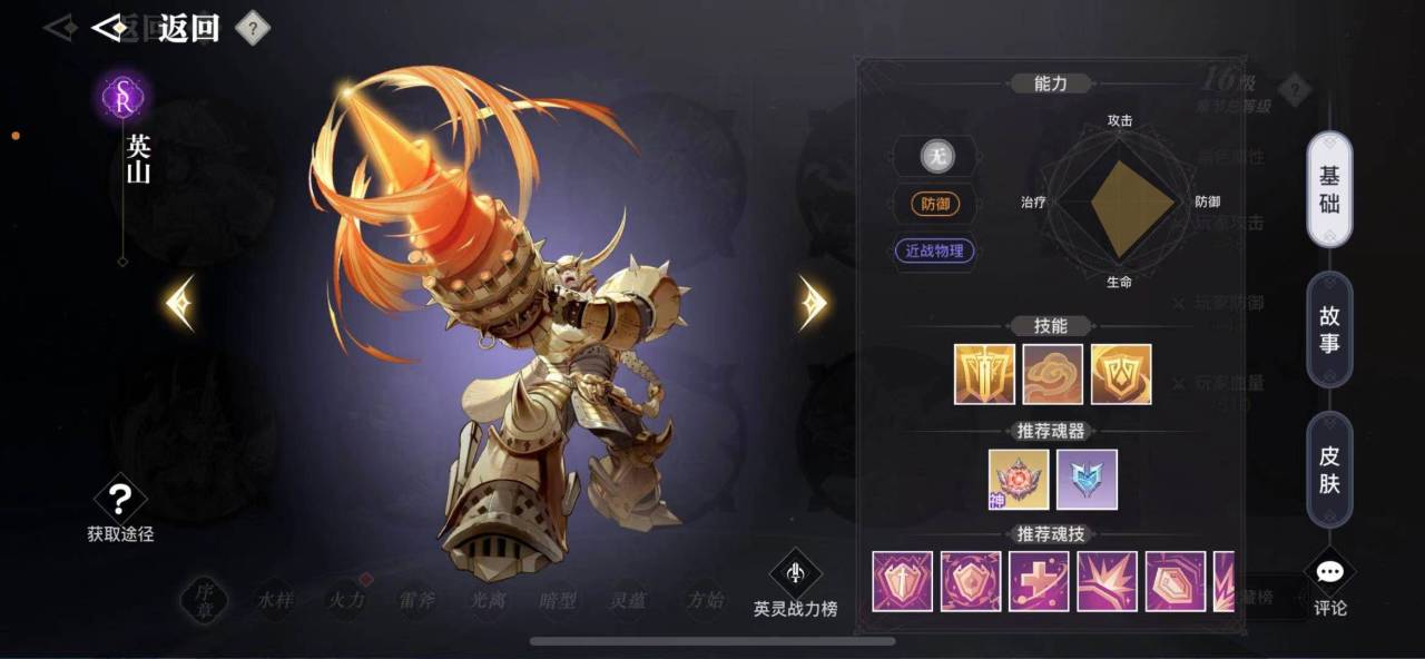 英山这种英灵培养起来很简单,普攻可以推进对方的气绝条,让BOSS无法释放大招,二技能可以让全队获得英山生命值百分之60的护盾,搭配上圣堂本身的护盾技能非常合适。当英山的血量高于百分之80的时候可以提供2倍的护甲值,因此搭配一个奶妈型英灵给它最好。