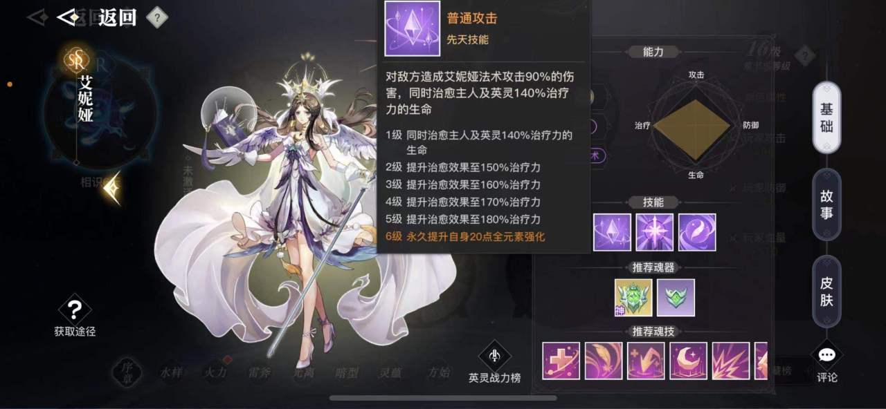 艾尼亚:唯一的一个可以回血的英灵,这个英灵的普通攻击就是回血,倍率高达1.8,其他两个技能都是给我方提供百分比的物理和魔法抗性和伤害减免。