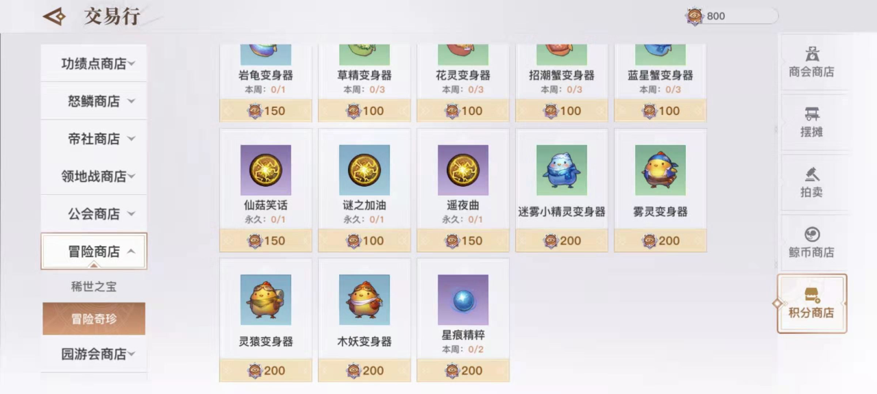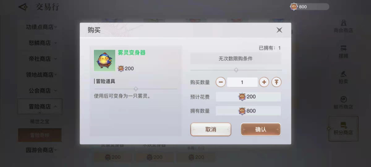第一、打开交易行界面,在其中选择最下方的积分商店,然后再找到冒险商店中的冒险珍奇,在其中就可以看到雾灵变身器了,每个雾灵变身器需要花费200点冒险积分,购买之后可以使用20次,还是比较划算的。