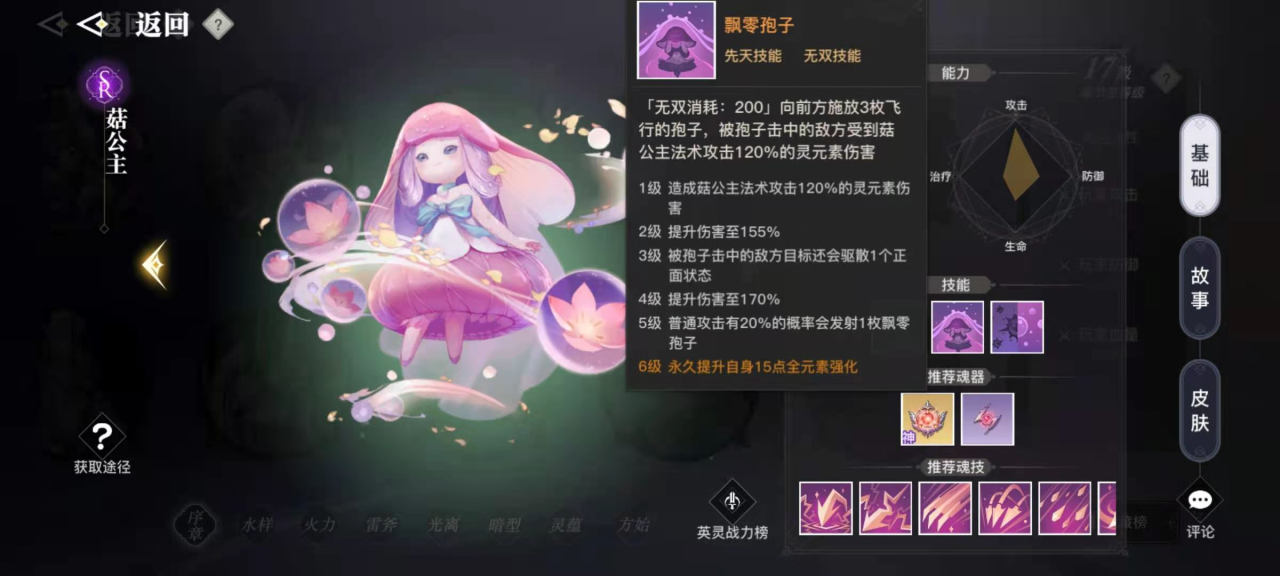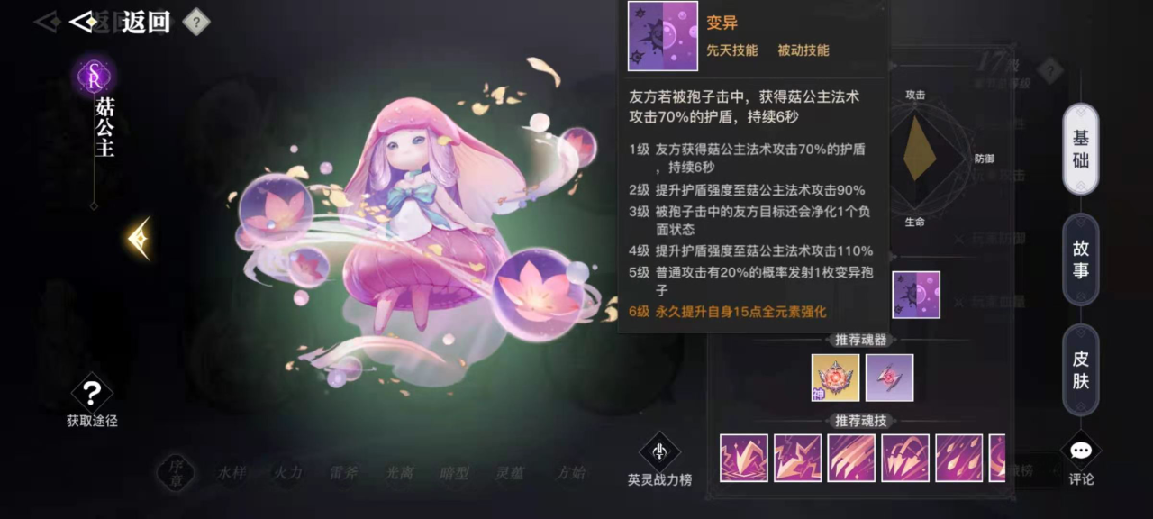 茹公主的一技能飘零孢子,使得茹公主可以释放出孢子攻击,被击中的目标会被清除所有的增益状态,二技能变异,使得友方目标被击中后,茹公主可以为其施加护盾,并且驱散减益BUFF,是奶妈的强力补充辅助。
