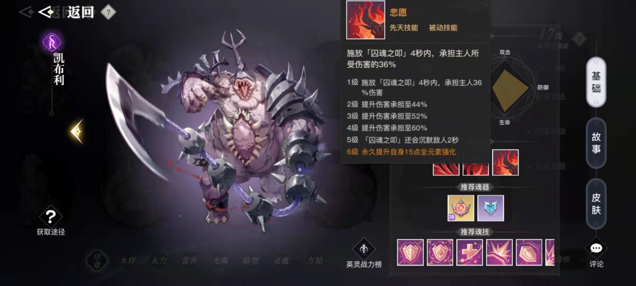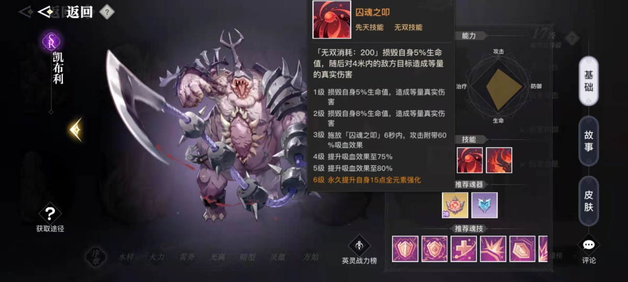 凯布利属于暗属性的防御性英灵,攻击方式是近战物理伤害,一技能囚魂之叩,消耗自身5%的血量来对目标造成等量的真实伤害,升级之后还可以附带80%的吸血效果,伤害也提升到8%最大血量。