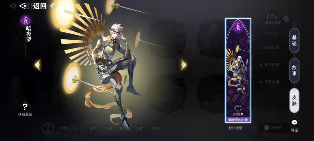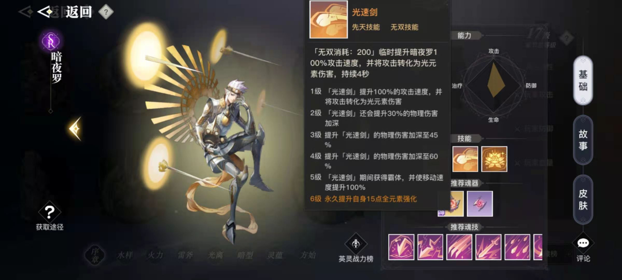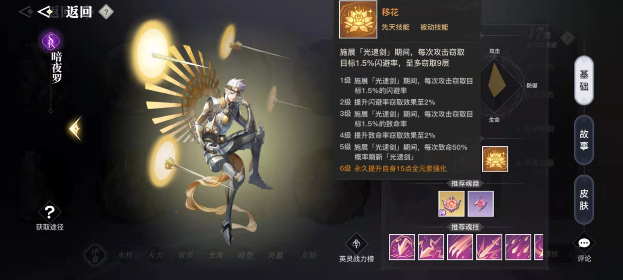 暗夜罗的一技能技能光速剑,可以临时提高暗夜罗的攻击速度,并且附带元素伤害,升到满级后除了伤害提高以外,还有额外的霸体效果。二技能移花,效果是在使用光速剑之后每次攻击可以窃取对方的闪避,间接削弱了对手的防御,变相的加深伤害。