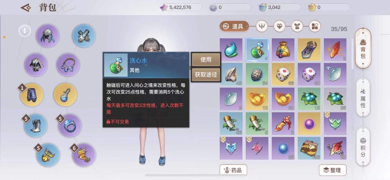 2.洗心水是改变性格最快的方法,使用这个道具可以一次性改变25点性格数值,有个几十瓶就可以达到玉虚需要的性格啦。