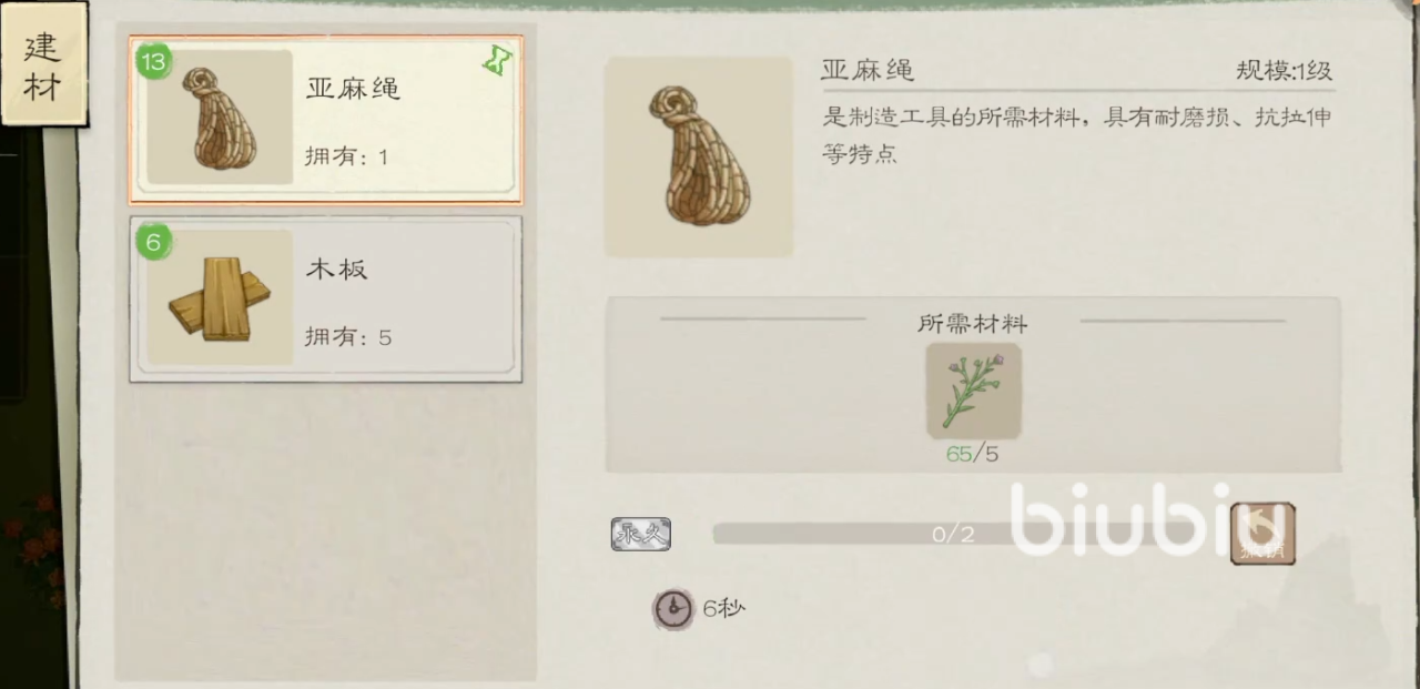 这四个类型分别为制作,居所,生产和功能。咱们在建筑的主页面可以看到建筑介绍,繁荣度,耐久以及所需材料。每一个建筑都会带来一定的繁荣度,而我们的桃谷想要进行升级的话则是需要满足一定的繁荣度才可以。所以前期可以选择繁荣度高的建筑优先建造。