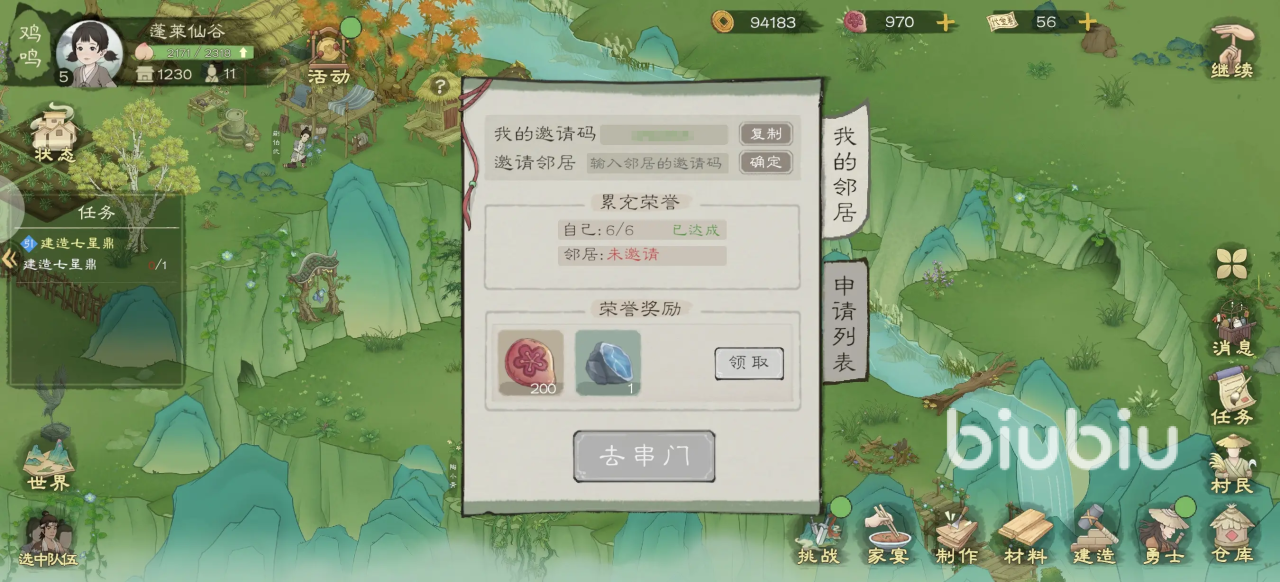 荣誉奖励:在邀请了正式的邻居之后,在自己和对方的累充达到了一定额度之后,就能领取奖励了;邀请邻居也是有一定的条件限制的,需要两名玩家是同时在线的,一方输入了另一方的邀请码就能申请,等另一方通过后,两人就能绑定邻居关系了。