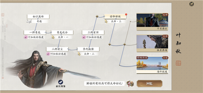 完成叶知秋天命结局一二,在奇遇中达成逃生之钥,在叶知秋红尘一刻达成钱王秘钥,在叶知秋天命结局中达成密道之钥。同时在选择剧情走向是选择动之以情才能出发特殊结局天命,改变叶知秋死亡的命运。