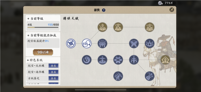例如选择游侠职业,可以使用天水蝶和南华蝶探索藏在世界各处的宝物有一定几率获取古玩。同时在这个界面中还可以查看和升级职业天赋。每个职业进行活动都需要消耗活力。