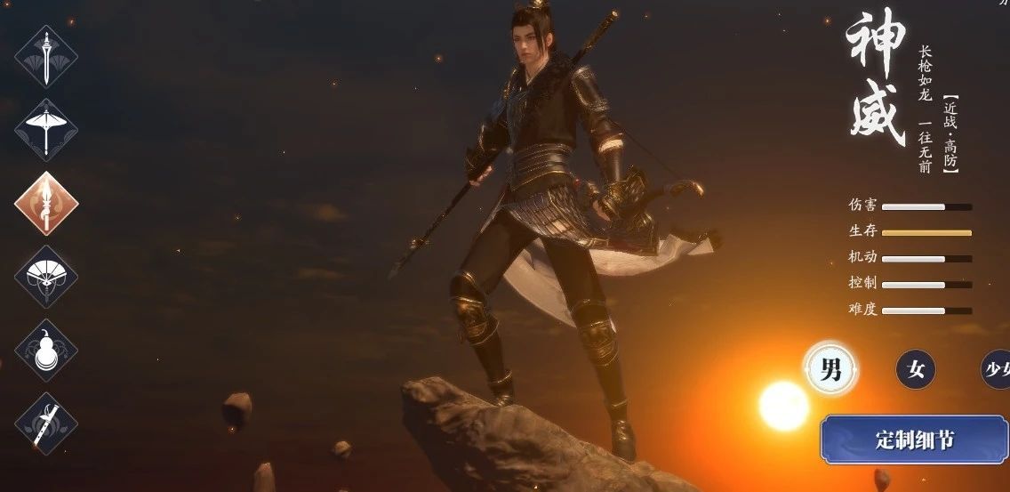 近战中手最长的,免控多爆发高而且生存强,因为被动天赋的作用,所以神威防御,加血,生命值都比其他的职业强的多,压3000功力就能保证2个浮空后秒人,充钱玩家必选职业。