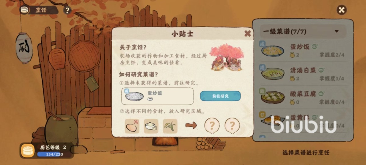 目前游戏内一共有数十道美味的佳肴,这些美食都是可以通过厨艺等级去解锁的,玩家们可以通过做饭以及解锁菜谱的方式去提升厨艺等级,玩家们首先解锁菜谱,根据菜谱的名称选择需要的食材,例如蛋炒蛋,我们就需要鸡蛋和大米,成功解锁之后可以获取一定的经验点数。