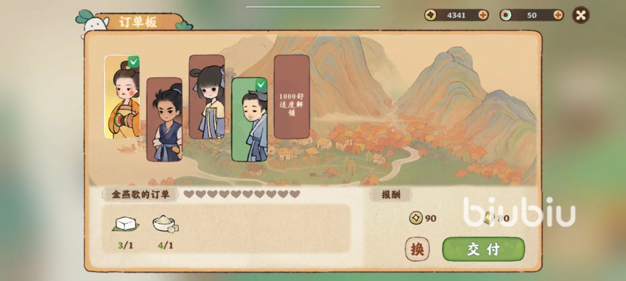第三种方法,玩家可以通过完成订单去获取,订单也是游戏内的一个非常主要的玩法,我们可以在达到特定等级的时候解锁,订单板会根据我们的舒适程度来解锁不同的居民需求在这里,玩家可以根据他们的订单要求去准备,准备齐全之后,点击交付,玩家可以获取一定数量的铜钱以及经验,所需要的订单材料越好,玩家们所能获取的报酬就会越多,这个也是成正比的,同时还能提升居民的好感度。
