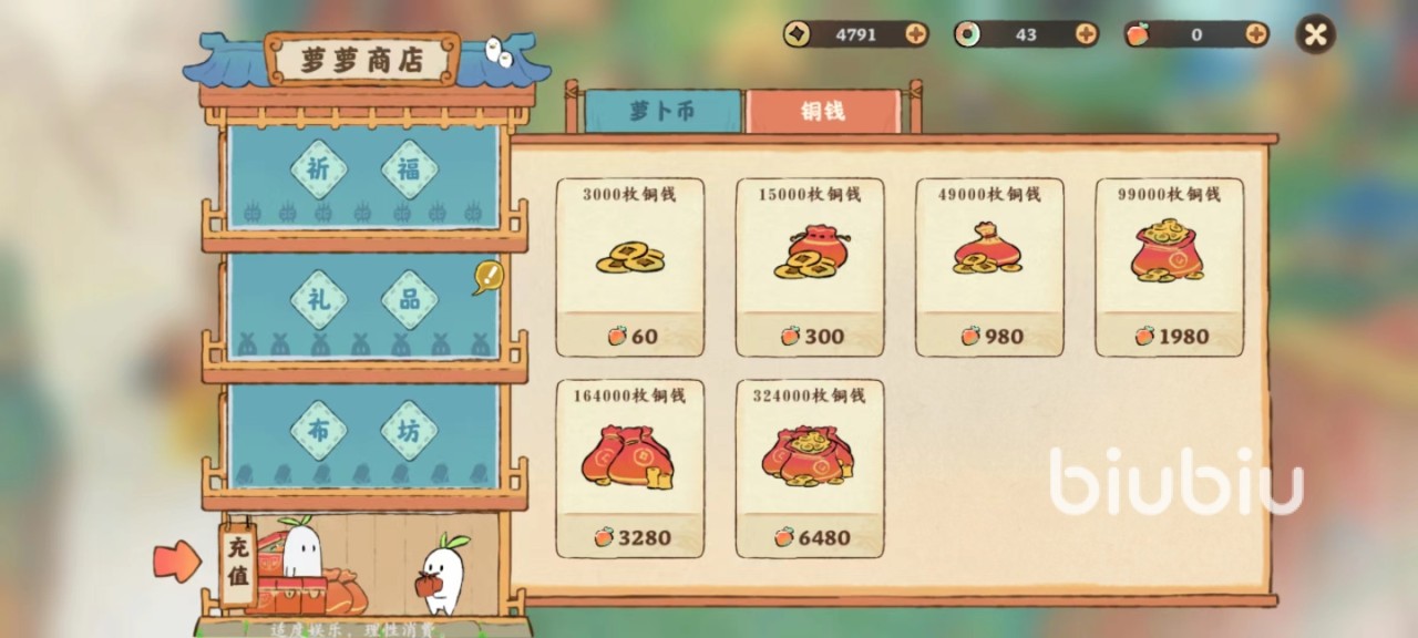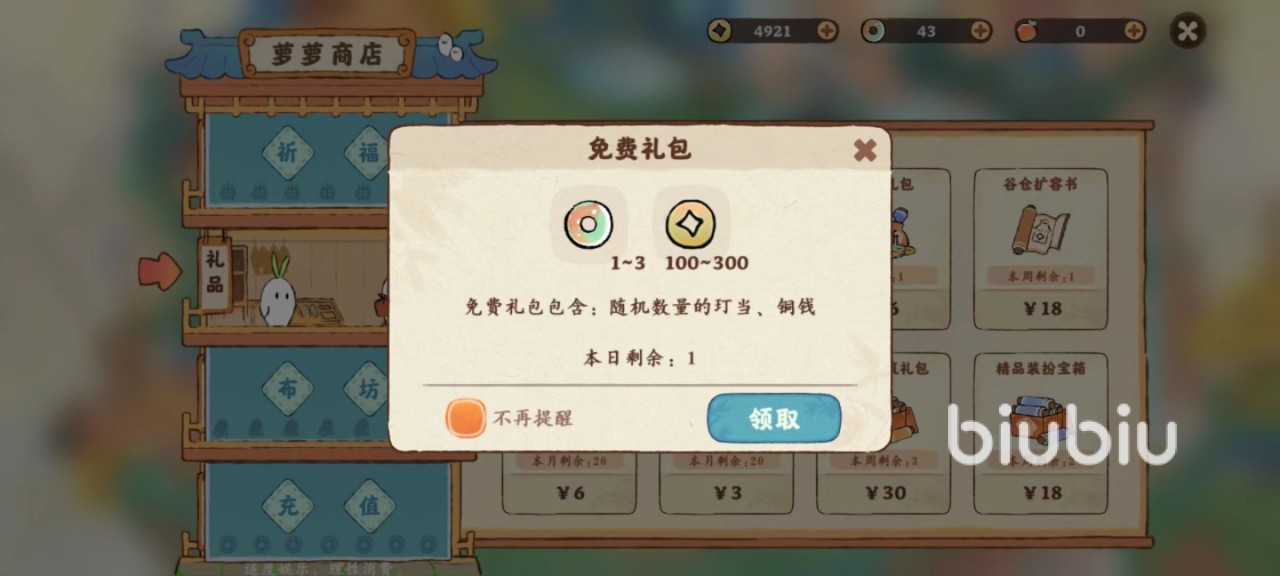 铜钱属于游戏内的重要物资,我们可以通过多方渠道去获取,目前游戏内可以获取铜钱的方法一共有四种,首先第一种玩家可以通过购买获取,我们可以打开萝萝商店,在其中花费萝卜币就可以购买铜钱,购买比例为1:50,第二种方法,玩家可以在礼品界面进行免费领取,在这里玩家们每天可以领取一个每日礼包,获取100到300左右的铜钱,还包括随机数量的叮当,这些都是可以快速获取的。