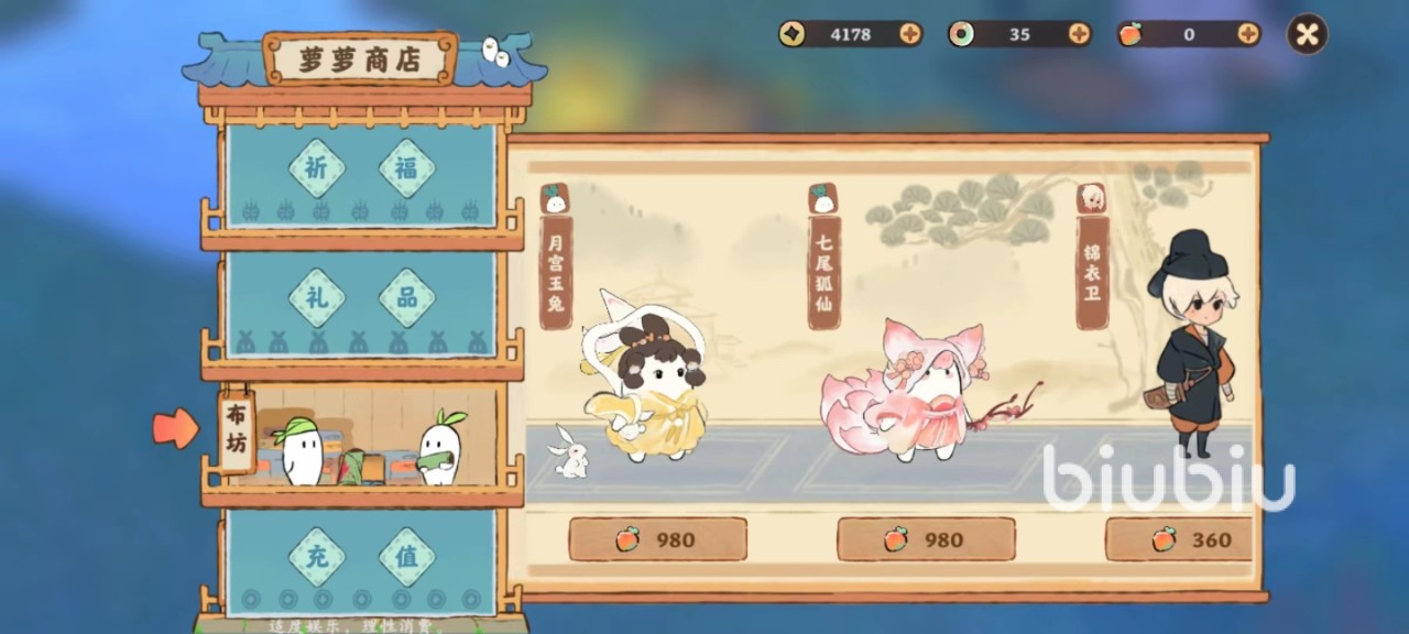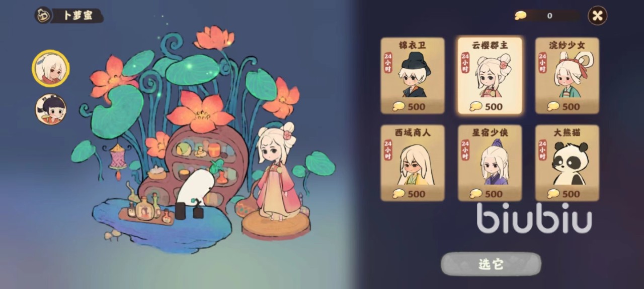 外观不只是建筑外观,这都是很常见的,可以通过升级以及做任务,或者抽奖的方式获取,还有一种就是人物外观,大家别看这些人物外观看上去很简单,但是更换起来也是有一定的讲究,首先玩家们可以给两个主角更换外观,我们可以在萝萝商店进行购买,在布庒内是有很多不同的外观的,玩家们直接购买即可,花费萝萝币。