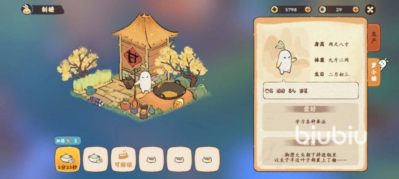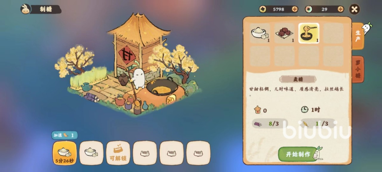 制糖都是有时间限制的,玩家们将需要的原材料准备好,直接点击开始制作,然后花费铜钱和时间就可以了,如果觉得时间等待的太漫长,可以使用加速符加速,后续这些糖果还可以用于完成各种各样的人物,提升与其他居民的好感度哦。
